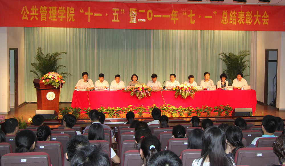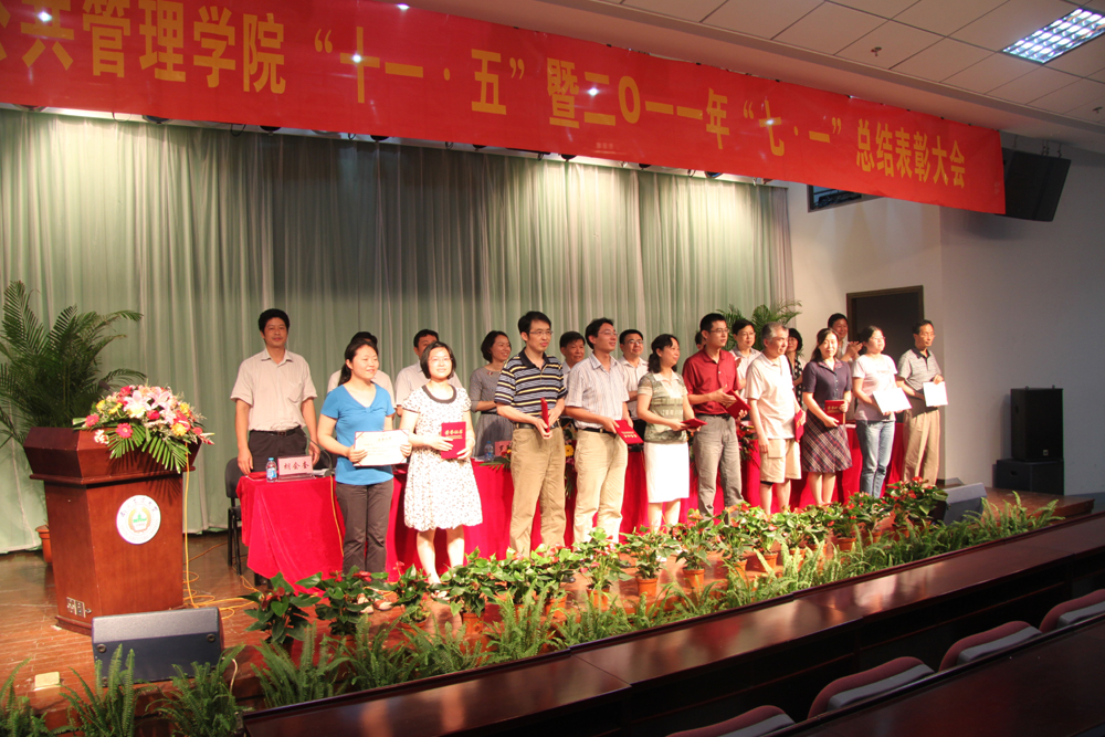 6月22日下午,公共管理学院“十一五”暨2011年“七一”总结表彰大会在教四楼报告厅隆重举行。校党委书记管恒禄、人事处处长董维春、研究生院常务副院长罗英姿、教务处副处长李俊龙、科技处副处长俞建飞、学工处副处长王录玲及公共管理学院领导出席了总结表彰大会。获奖师生以及学院全体教职员工、部分研究生和本科生共300多人参加了会议,会议由学院党委副书记胡会奎主持。