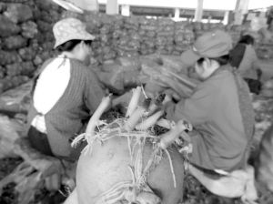 五六名女工围在一起,用工具将这些长芽土豆一一进行“修理”,她们用小刀将土豆上的芽挖掉,土豆表面出现被挖开过的圆形小洞,然后再去掉土豆上的腐烂部位,接着重新装袋包装。