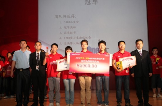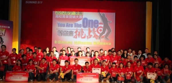 6月10日下午,“2012苏宁•全国高校菁英营销大赛”南京地区总决赛在苏宁总部成功举办,当天来自南京赛区的十支晋级团队、主办方嘉宾、高校领导以及数百位亲友团成员参与了此次比赛。经过4个小时的激烈比拼,最终南京财经大学luckone团队、东南大学FINE CLUB团队、南京大学easygo团队分别获得南京地区的冠亚季军,并相应获得奖金5000元、3000元、1000元,同时他们也将代表南京地区参加10月份举行的全国总决赛。