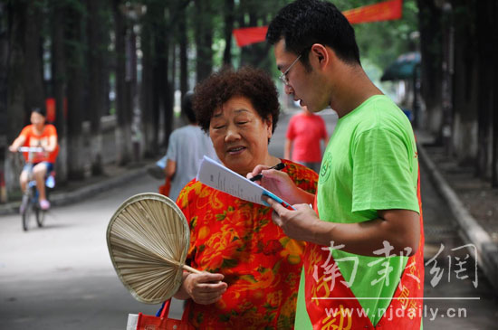 炎热的夏日挡不住志愿者服务社会的热情。7月11日,大学生志愿者与栖霞区司法局、中石化南京工程公司携手在栖霞区尧石二村开展社区法律广场普法宣传活动,为社区居民现场解答疑惑,解决他们现实中面临的法律难题。现场,志愿者还通过法律常识有奖问答的形式进行普法教育,得到社区居民的踊跃参与。南京电视台“法治现场”栏目、栖霞区电视台对活动进行了现场报道,活动影响力广泛。