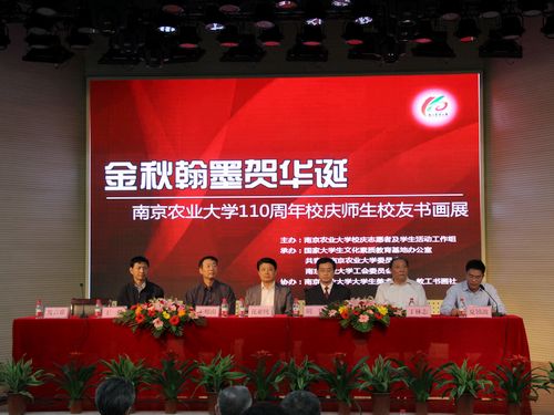 2012年10月16日,“‘金秋翰墨贺华诞’——南京农业大学110周年校庆师生校友书画展”在学校大学生活动中心拉开帷幕。校党委副书记花亚纯,校党委常委、副校长胡锋,退休校领导王耀南,校工会主席丁林志,国家大学生文化素质教育基地办公室主任王恬,以及部分参展师生代表出席本次书画展开幕式。开幕式由校团委书记夏镇波主持。