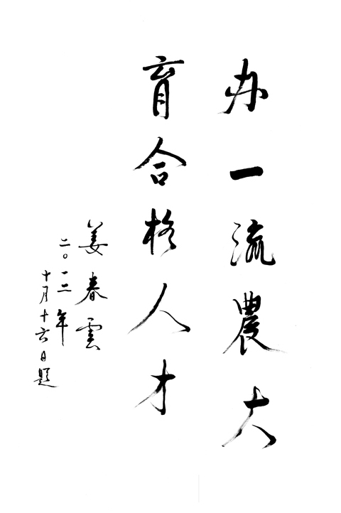 原中共中央政治局委员、国务院副总理、全国人大常委会副委员长姜春云题词:“办一流农大,育合格人才”