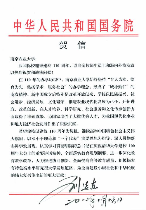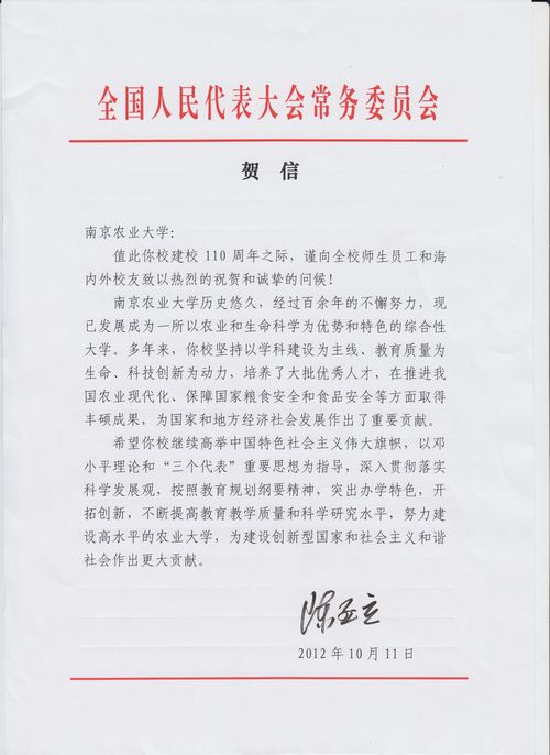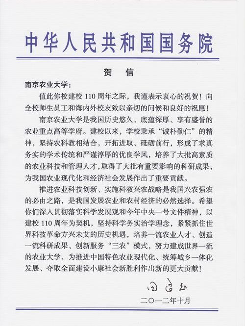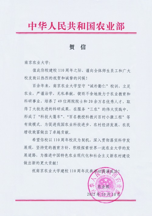 在南京农业大学迎来建校110周年华诞之际,关心学校建设发展的党和国家领导人,省市领导,海内外校友,上级领导单位,兄弟高校等纷纷为祝贺南京农业大学建校110周年题词或发来贺信、贺电。