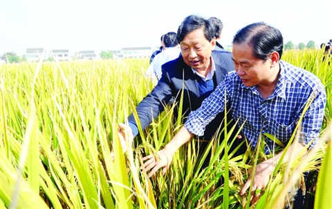 昨天,农业专家在相城区望亭迎湖村了解水稻生长情况。□记者濮建明摄