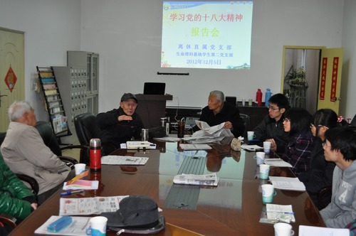 10月5日下午,离休直属党支部与生命科学学院理科基地学生第二党支部在老干部活动室举行学习党的十八大精神报告会。离休直属党支部书记王新群,支委成员、老党员、老干部办公室副主任陈明远及学生党员等与会交流学习心得和体会。报告会由离休直属党支部副书记、老干部办公室副主任张鲲主持。