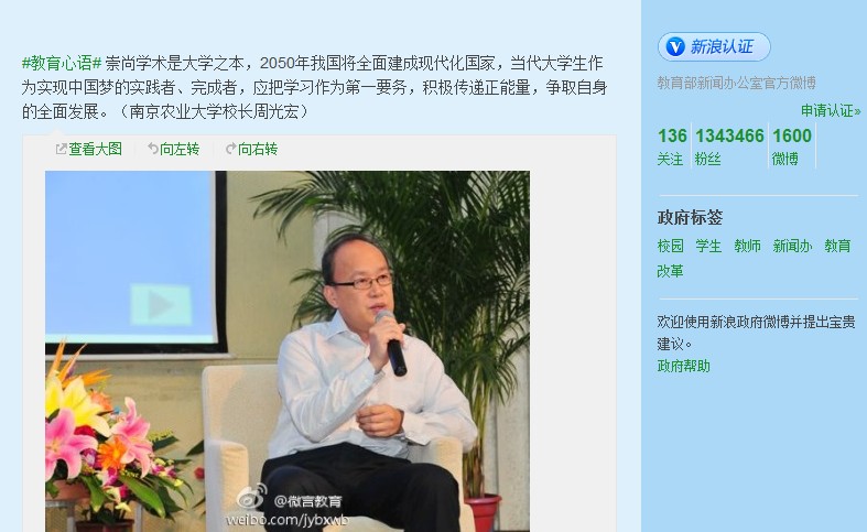 该微博引用我校校长周光宏在与本科生开展“面对面”活动,针对学生自身发展、校园生活以及学校建设世界一流农业大学等问题畅谈时,勉励学生的一段话:“崇尚学术是大学之本,2050年我国将全面建成现代化国家,当代大学生作为实现中国梦的实践者、完成者,应把学习作为第一要务,积极传递正能量,争取自身的全面发展。”并同时通过新浪微博和腾讯微博平台进行了发布。(新浪微博:http://e.weibo.com/2737798435/zmW7kmga5,腾讯微博:http://t.qq.com/p/t/220028013330462 )