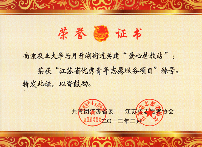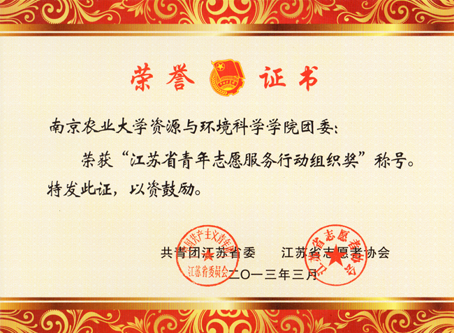 日前,共青团江苏省委、江苏省志愿者协会对全省2012年度志愿服务先进集体和个人进行了表彰。我校资环学院团委荣获“江苏省青年志愿服务行动组织奖”,园艺学院与月牙湖街道共建“爱心特教站”项目荣获“江苏省优秀青年志愿服务项目奖”,研究生工作部副部长李献斌荣获“江苏省青年志愿服务事业贡献奖”,王璐、胡丹2名学生荣获“江苏省优秀青年志愿者”称号。