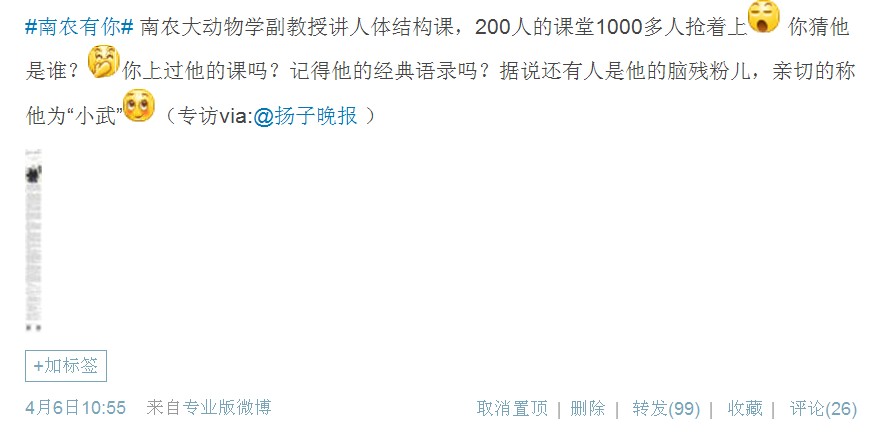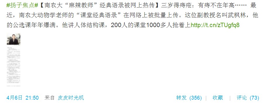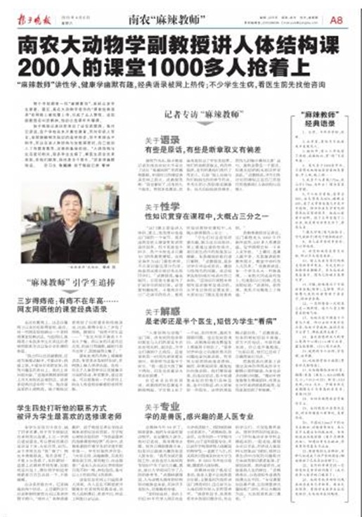 近日,我校动物学副教授武枫林老师的公选课经典语录在网络热传,他在《人体结构与功能》的公选课中融入了性学、健康学的基本知识,授课风格幽默风趣,200人的课堂1000多人抢着上。4月6日,《扬子晚报》以整版的篇幅介绍了这位“麻辣教师”,并摘录了学生上传的经典语录,我校官方微博第一时间对报道进行了转载,粉丝互动踊跃,转发量数百条,扬子晚报官方微博扬子焦点栏目也对此进行了再聚焦。