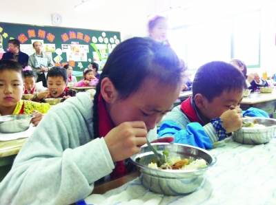 右图:参加“试吃会”的小学生们首尝“营养午餐”。