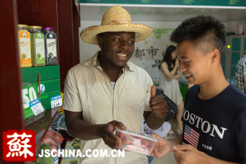 中国江苏网6月21日讯(记者 刘北洋)今日,记者在位于南京农业大学三号门童卫路上的社区感知农业体验店看到,一群戴着草帽的非洲留学生正在推销他们的社区感知农业模式,吸引了来往路人的围观。