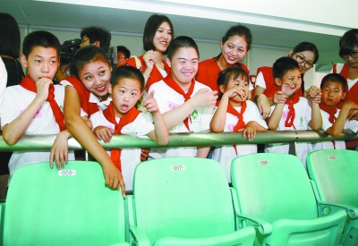 昨天︐秦淮特教学校的学生们在志愿者的带领下︐参观即将举办亚青会的比赛场馆︒