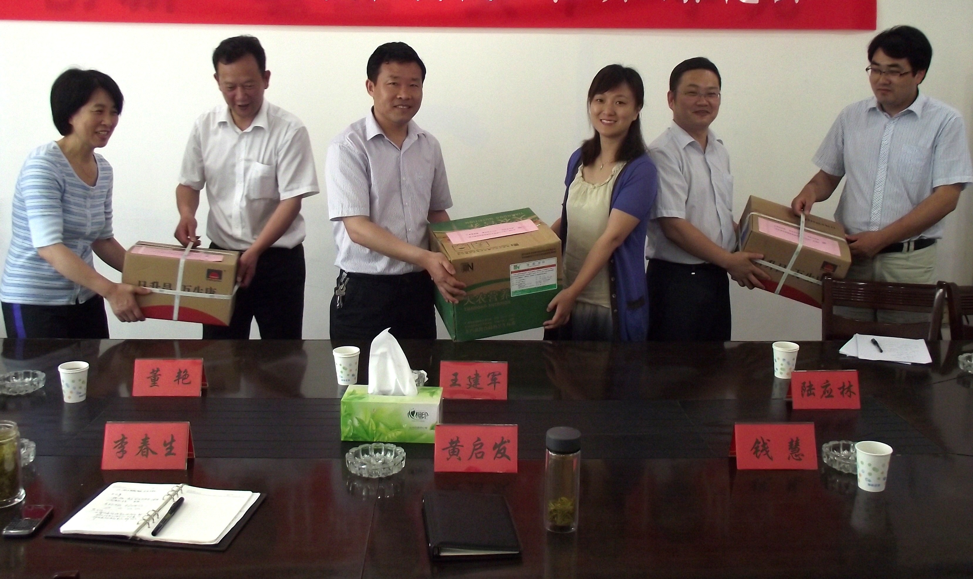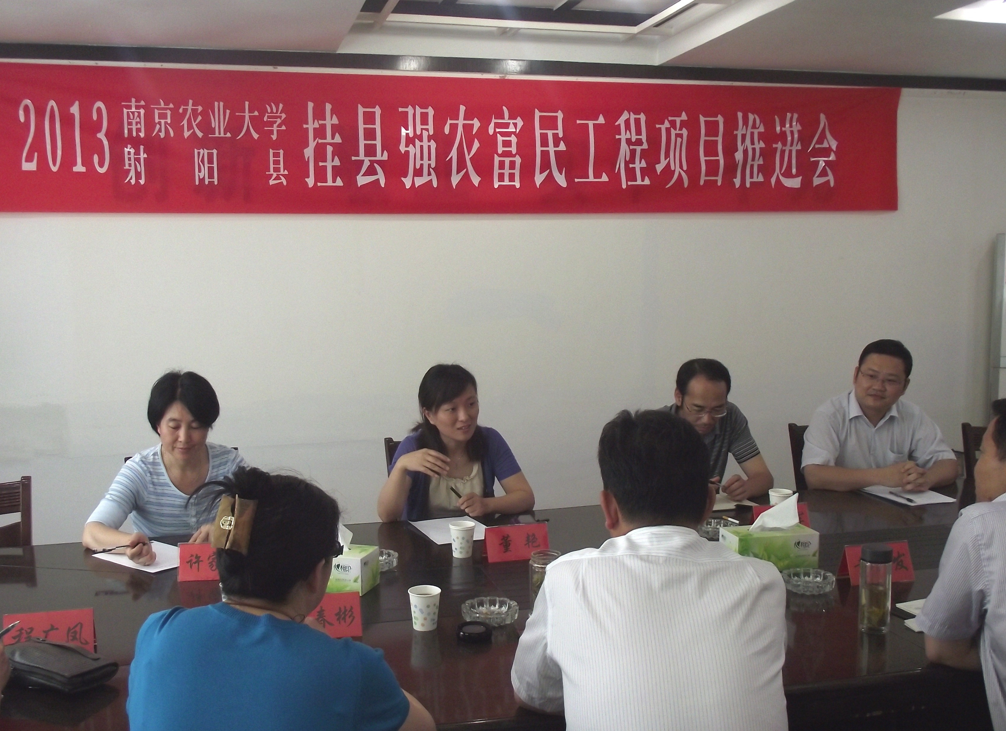 6月22日,我校科学研究院产学研合作处组织项目组陆应林、许家荣、王建军等专家来到盐城射阳县,与当地农委召开挂县强农富民工程项目推进会,双方就项目实施进展情况和下一阶段的工作进行了讨论。