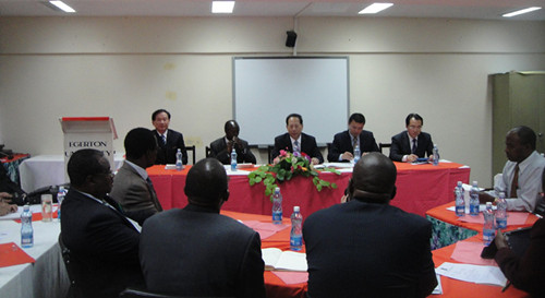 沈其荣汇报了我校援肯工作情况。1995-2002年,我校与埃格顿大学执行了“中肯高教合作计划”,成为新时期第一批启动教育援非的高校之一。2010年以来,两校执行了“中非高校20+20合作计划”。2012年7月,两校获准建设全球第一所农业特色孔子学院。孔子学院在开展汉语教学和中国文化推广的同时,传播先进、实用的中国农业技术,不仅在埃格顿大学掀起了汉语热,也将为肯尼亚的农业发展做出积极贡献。沈其荣表示农业特色孔子学院是我校建设世界一流农业大学宏伟目标的一个重要组成部分。