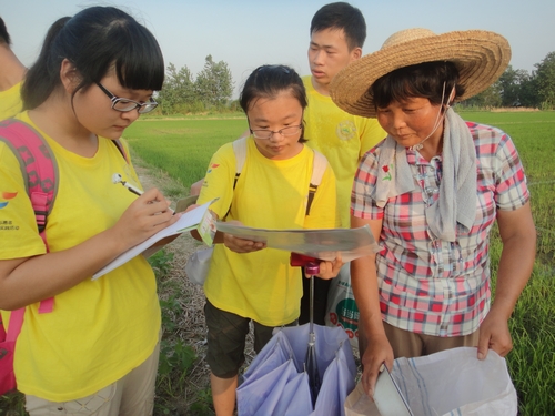 山阳镇地处里下河地区,东依京杭大运河,西邻白马湖,南靠宝应湖,域内广泛种植稻麦,是传统的农业大镇。大学生志愿者们与当地较具影响力的农资经销商进行交流,了解了当地农户常用的农药、化肥种类和知名品牌,走访了合心村、徐杨村、吴坝村等地近百户村民,就“2013年农民心目中的好产品”进行问卷调查,并通过卡片、戗牌等方式宣传农业知识。志愿者们表示,在农村劳作的基本上是老年人,他们对农药、化肥品牌的认知并不科学,购买产品时则多由农资经销商进行推荐。