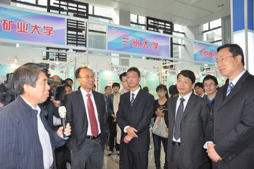 开幕式结束后,江苏省科技厅常务副厅长王秦、宿迁市委书记蓝绍敏、代市长王天琦一行来到我校展区,询问我校宿迁设施研究院和建设和运行情况,侯喜林进行了详细介绍。