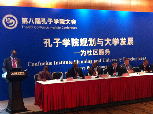 会议期间还举办了校长论坛及优秀办学案例论坛、孔子学院总部项目咨询会及国际汉语教材与文化读物展等系列活动。与会代表围绕孔子学院规划与大学发展、实施“孔子新汉学计划”、发展本土师范专业等议题,结合教材编写与数字化、孔子学院与“慕课(MOOC)”等优秀案例进行了深入讨论。肯尼亚埃格顿大学托涛伊克校长在8日上午的校长分论坛“孔子学院发展与服务社区功能”上作报告,他回顾了我校与埃格顿大学近二十年的合作历程,重点介绍了两校合作建设的孔子学院充分利用双方在农业教育与科研方面的优势与特色,通过农业示范园区建设、农户帮扶等举措带动地方农民致富,推动社区经济发展的成功做法。