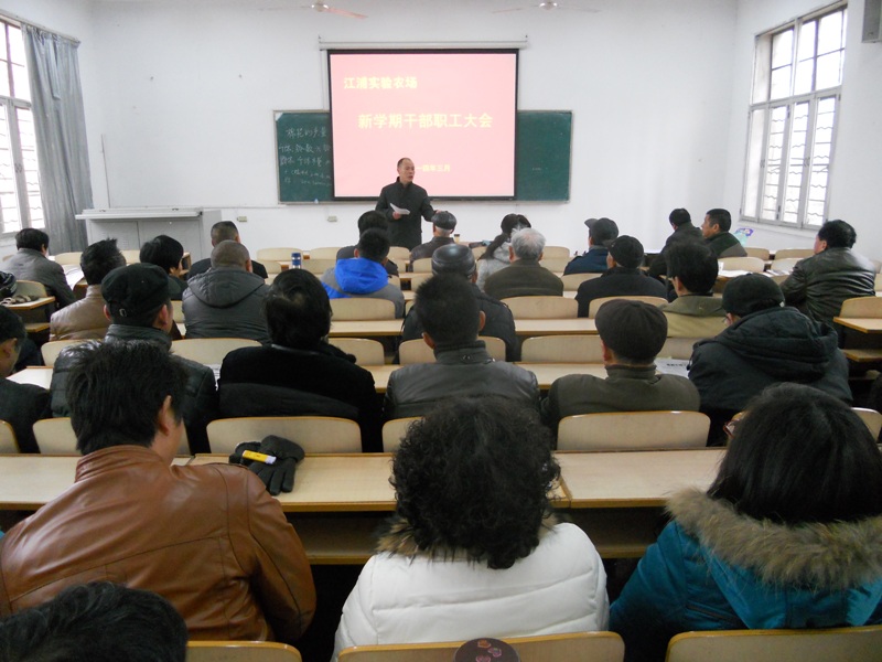 3月6日,江浦实验农场在场部大教室召开新学期干部职工大会,学习传达学校中层干部大会会议精神,部署农场新学期工作,总结党的群众路线教育实践活动。全体农场职工、离退休老同志代表参加了会议,会议由农场场长刘长林主持。
