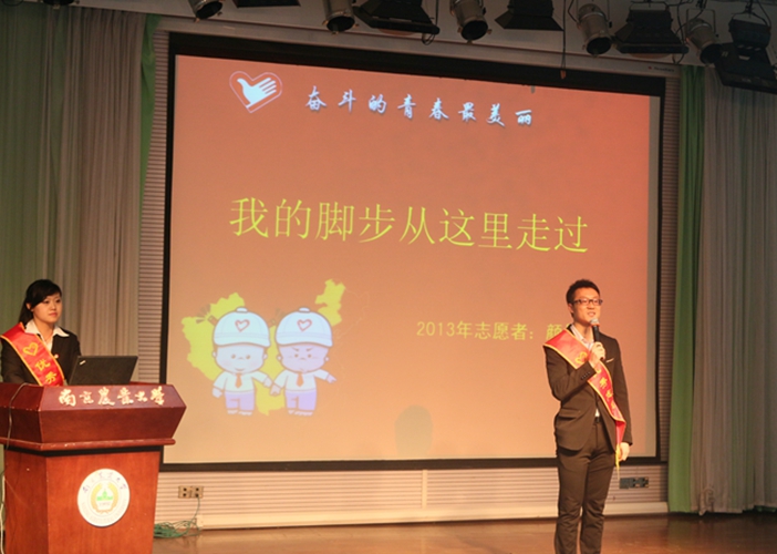 4月25日下午,“奋斗的青春最美丽”2014年大学生志愿服务西部计划优秀志愿者事迹报告会在教四楼报告厅举行。新疆自治区青年就业指导中心办公室副主任李凤、江苏团省委志愿者工作部副部长施静芝、南京农业大学团委书记夏镇波出席本次报告会。