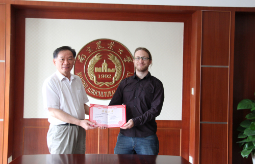 2014年5月23日下午,我校在校办会议室举行客座教授聘任仪式,聘任荷兰乌特勒支大学Alexandre Jousset博士为我校资环学院外籍客座教授。沈其荣教授为Alexandre Jousset博士颁发了聘书。