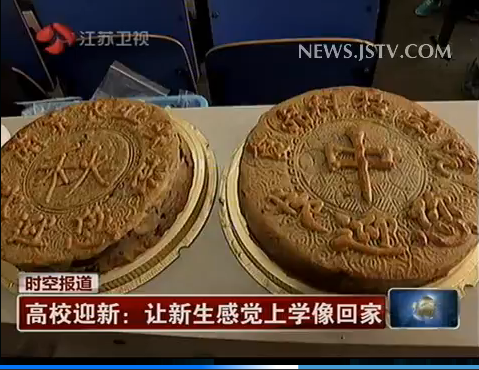 在食品科技学院,学长学姐们亲手为新生和家长们准备了四只中秋大月饼,往常的月饼只有手掌大,迎新的四个月饼,每只都足足有12寸,并且分别刻上了“中秋快乐”的字样,让新生不仅饱了口福,还对自己的专业有了感性的认识。