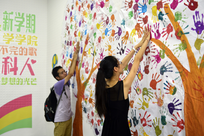 同样贴心的策划来自植物保护学院,他们今年的迎新以“家”为主题:墙上挂着“家谱”签到墙,每位新生在上面签了名,就意味着从温馨的“小家”步入植保院“和谐”的大家,家长们会领到一份“家书”,写下对孩子的期待。