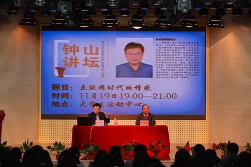 11月19日,由学生工作处主办、公共管理学院承办的钟山论坛在大学生活动中心举行。南京大学社会学院副院长、博士生导师成伯清教授作题为《互联网时代的情感》的报告。讲座由学生工作处副处长李献斌主持。卫岗校区近400名学生聆听了讲座。