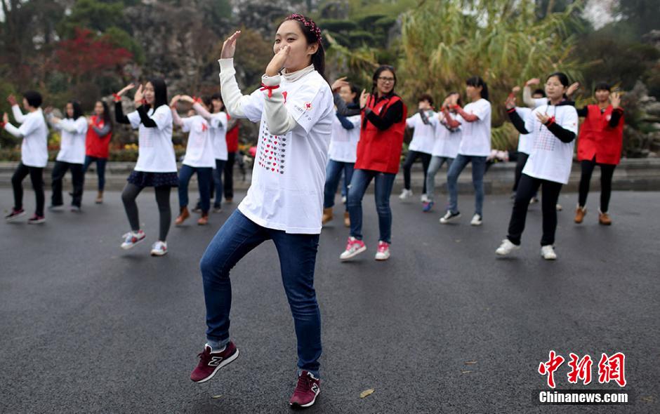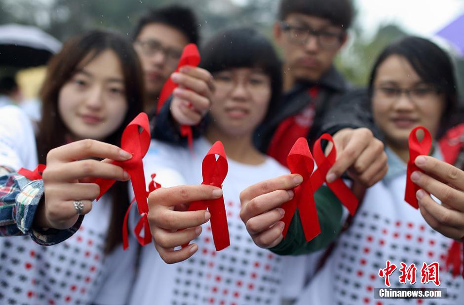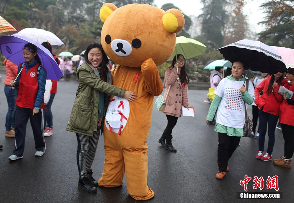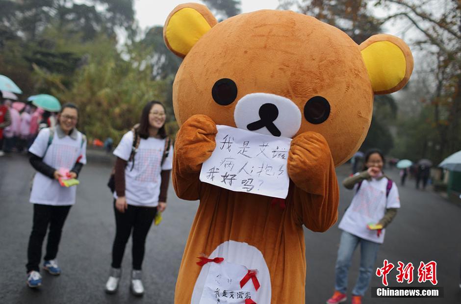 11月30日,来自南京农业大学红十字会学生分会的百余名大学生志愿者来到玄武湖等地,举办以“行动起来,向‘零’艾滋迈进”为主题的公益活动,通过与贴有“我是艾滋病患者,抱抱我好吗”字样的大熊相互拥抱、舞动神曲“小苹果”、发放防艾红丝带等互动活动,向民众宣传艾滋病防治知识,呼吁关爱艾滋病人。12月1日是第27个“世界艾滋病日”,今年世界艾滋病日活动主题仍为“行动起来,向‘零’艾滋迈进”,副标题为“凝聚力量,攻坚克难,控制艾滋”。泱波 摄