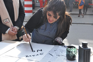 师生以中国传统文化瑰宝——书法,共书“祭”字,以表达哀悼之情;同时,以书法“梦”字,表达他们对实现中华民族伟大复兴的中国梦的坚定信念。原南京农业大学副校长王耀南教授,农学院杨世湖教授、陈佩度教授和黄丕生教授等亲临活动现场挥毫泼墨,表达缅怀之情。王耀南教授题下了“不忘国耻,振兴中华”八个大字,表达了他对青年学生的殷切期盼,他希望广大青年学生能够铭记历史,缅怀过去,在新时代的起点上,不畏艰险,奋勇拼搏,用自己的智慧和双手托起祖国更加繁荣的明天。此外,还有少数民族学生、留学生参加到此次活动中来,他们或用维语,或用英语,表达他们的悼念之情。
