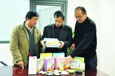 三位创始人在讨论新产品包装,从左至右为聂信天、顾振新、王仪峰。徐兢/摄
