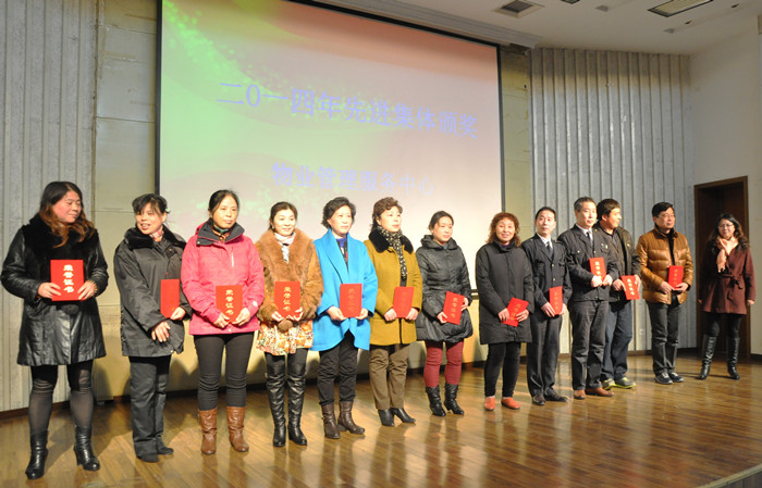 物业管理服务中心主任刘媛宣读了表彰决定。姜岩、胡会奎、赵建业分别为11个2014年度工作质量考评先进班组、62名先进个人,48名拾金不昧员工颁发了奖品和奖状。