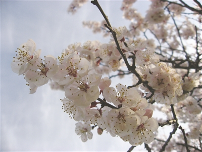 特点:初开时只有白色,两三朵一簇,花柄比较长,比樱花短。