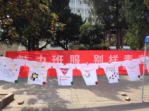 学院各参赛班级在玉兰路进行了班服的现场展示与讲解。各班分别派出代表讲解班服设计的灵感与意义,其中有中国版图的图案,寓意着班级成员们来自五湖四海;有一步接一步的脚印,喻示着脚踏实地时,方能仰望星空等等。过往的同学看到设计新颖的班服,纷纷为喜欢的设计投上一票,为设计者点赞。