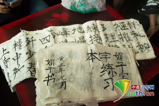 在杨家两兄弟的带领下,我们找到了刚刚升入初中二年级的周增娟家里。周增娟是个扎着小马尾的腼腆女孩儿,听到老师们来家访,就躲进了屋里不好意思出来。她的爷爷奶奶热情地迎接了我们。三岁的弟弟上蹿下跳,很快与我们混熟了,房间里洋溢着欢乐的气氛。爷爷一边喊孙女出来见老师,一边自豪地为我们展示周增娟写的毛笔字。周增娟自从在小学学习了书法后,一直非常喜爱,在家里没事的时候就独自练习。周增娟出来后,爷爷为她解释,说小姑娘长大了,长了青春痘,因此变得害羞了,学习成绩也因此下降了,以前学习成绩可好了,挂了一墙的奖状。说着这些的时候,老人家的笑容堆满了沧桑的面庞。
