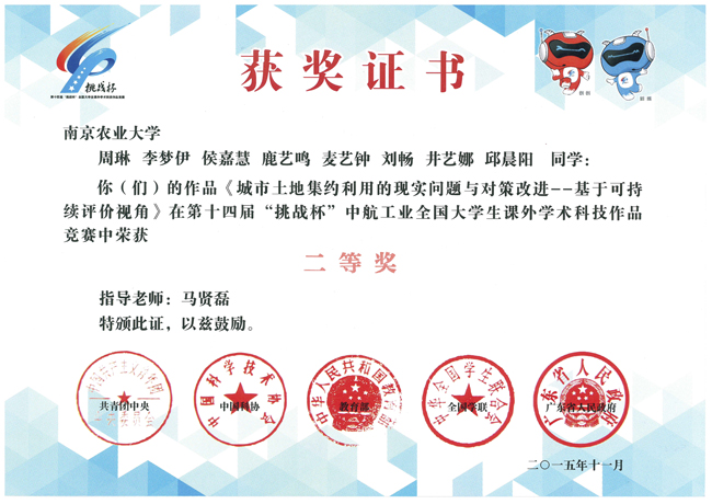 全国“挑战杯”竞赛参赛工作由校团委组织实施,得到了学校教务处、科研院等部门以及各学院的大力支持。大赛准备工作自2014年7月启动以来,历经学院遴选推报、校级竞赛选拔、江苏省竞赛等各个环节,最终我校推荐的作品《城市土地集约利用的现实问题与对策改进--基于可持续评价视角》入围国赛并进入终审决赛。该团队历时两年多时间,在老师的指导和学院的支持下,项目取得一系列成果,先后完成调研报告1份,在核心期刊发表学术论文2篇,参加学术交流2次,研究成果得到江苏省国土资源厅、安徽省国土资源厅等党政部门认可并书面推荐。在全国决赛中,参赛作品和团队现场答辩表现得到评委认可,最终获得全国二等奖。