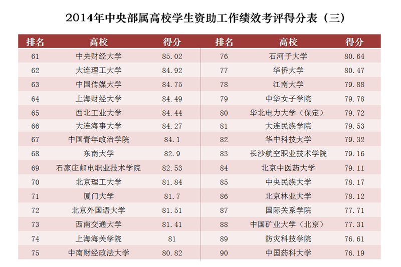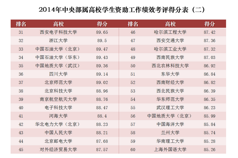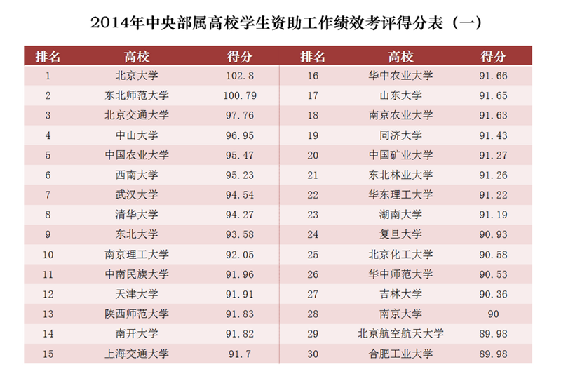 近日,教育部全国学生资助管理中心印发《2014年度学生资助工作绩效考评结果通报》(教助中心[2015]134号),对全国124所中央部属高校的学生资助工作进行考核评比,得分排名前30的高校评级为优秀。我校考评得分91.63分,位列全国第18名,江苏省第2名。