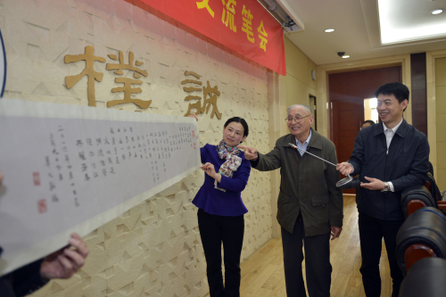 董维春介绍了我校的历史沿革、发展历程和建设世界一流农业大学的发展思路。资环学院宗良纲教授以“我与紫砂陶艺”为题,就我校的紫砂陶艺特色艺术与大学生的文化素质教育相结合等作了汇报交流。“国家大学生文化素质教育基地”兼职教授单人耘在笔会现场向来宾们赠送并吟诵了咏农诗两首。老同志聂国桢老师向江树人一行赠送亲笔题写的中国农大校歌《金色的希望》。两校相互赠送了书画、诗歌等书籍。