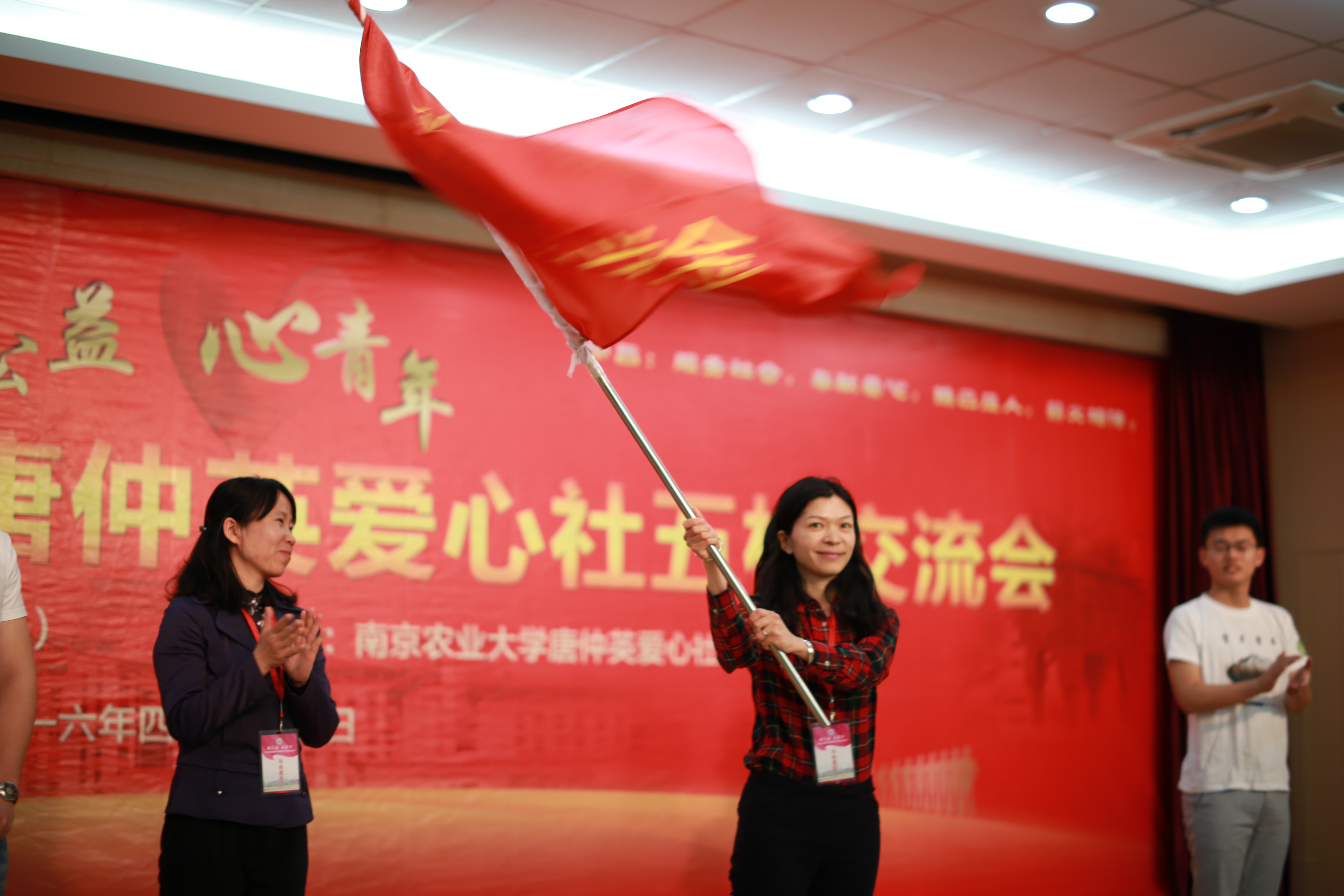 交流汇报结束后举行了五校交流会会旗交接仪式,下一届承办方东南大学江雪华从南京农业大学吴彦宁手中接过会旗,并向所有参会人员发出了邀请。江雪华表示,东南大学唐仲英爱心社也将在明年的交流会上为大家搭建良好的交流平台。