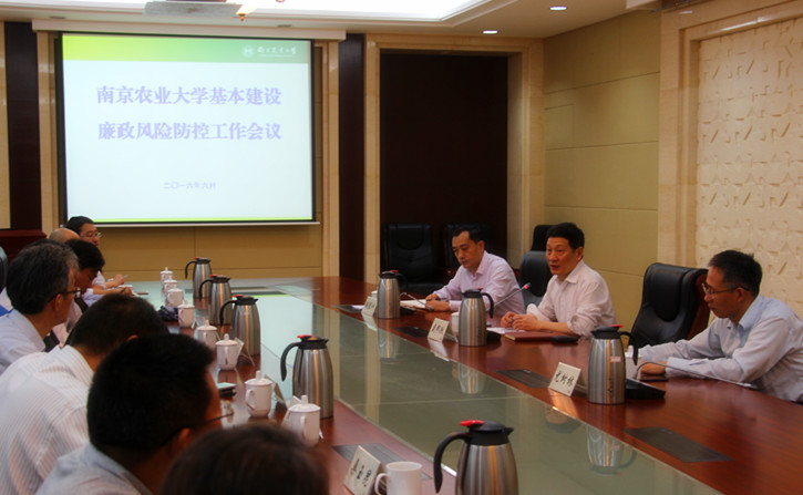 6月8日下午,南京农业大学基本建设廉政风险防控工作会议在金陵研究院二楼会议室召开。校党委副书记、纪委书记盛邦跃主持会议并讲话。我校纪委办、监察处、校区发展与基本建设处、计财处、招投标办公室、审计处、资产管理与后勤保障处、后勤集团公司、白马办以及工学院相关职能部门负责同志和工作人员参加会议。
