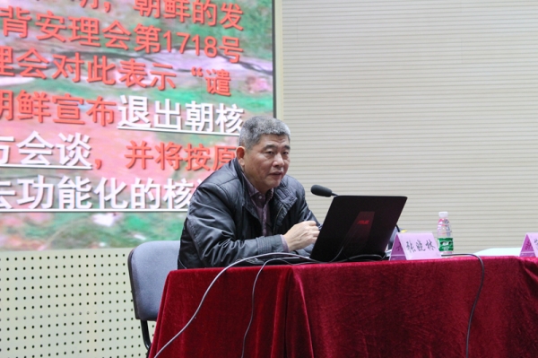 张晓林教授分析了朝核危机对国际政形势的影响,并结合“中朝友好合作补互助条约”“国际难民公约”等,分析了半岛核危机引发的大规模动乱或战争,对我国政治、经济、社会稳定的影响。张晓林教授指出,萨德入韩,可能使中国导弹威慑力衰减,引发连锁反应,触发美日军事同盟,造成新两大阵营对抗,从而可能颠覆整个东北亚格局。