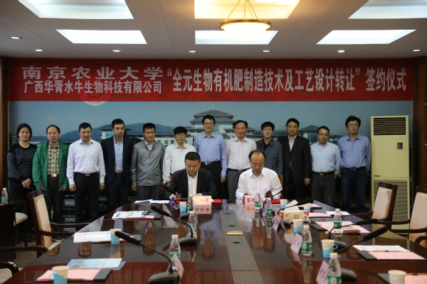 5月8日上午,“全元生物有机肥制造技术及工艺设计”科技成果转让签约仪式在我校举行。校党委书记左惟、副校长丁艳锋、校学术委员会主任沈其荣,广西华胥水牛生物科技有限公司董事长赵宏涛、法律顾问肖剑韬、广西大学动物科技学院院长石德顺、刘庆友教授等领导以及校党办、资环学院、科研院的相关领导和沈其荣团队的部分老师出席会议。会议由科研院副院长俞建飞主持。