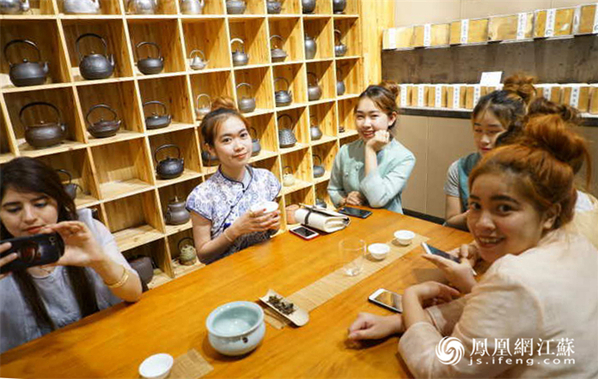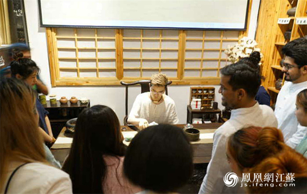 据了解,本次活动以茶席上的“一带一路”为主题,来自南京农业大学的“一带一路”沿线国家十余名留学生共同参与了茶道体验、书法体验等内容,感受中国传统文化。图为留学生体验中国茶道文化(泡茶、喝茶)。