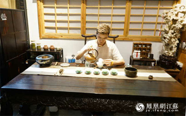 在当天茶道体验活动中,十余名南京农业大学的留学生还现场穿上了喝茶时必备的禅修服,随后还敬拜了茶圣陆羽和孔子。让这些热爱中国传统文化的留学生们不囿于体验文化,而是真正走进、融入中国传统文化之中。图为专家现场为学生演示茶道技巧。