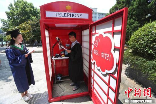 6月11日,毕业生在用电话亭改装的朗读亭内朗读。当日,南京农业大学举行“听音如见”毕业季感念师恩活动,近百位本科生和研究生走进校园朗读亭,通过一个故事、一段回忆或是一段诗歌,将自己想对老师说的话,通过声音和影像记录下来。据了解,校方后期还将把音视频资料剪辑成光盘,作为学生送给老师的一份特别的毕业礼物。