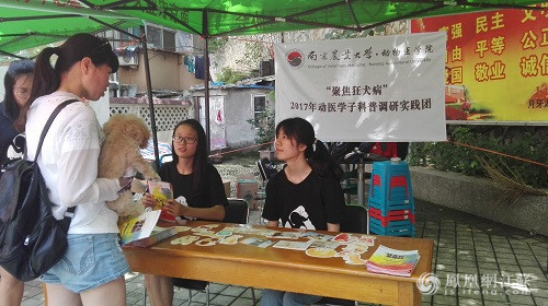 在活动中,由南京农业大学动物医院副院长赵艳兵(高级兽医师)带领10多名动物医学专业学生实践小分队通过印发宣传资料、有奖知识竞赛、趣味游戏等丰富的形式,提醒宠物主人们一定要及时给宠物注射疫苗,并宣传了如果不慎被犬咬伤后的处置方法。
