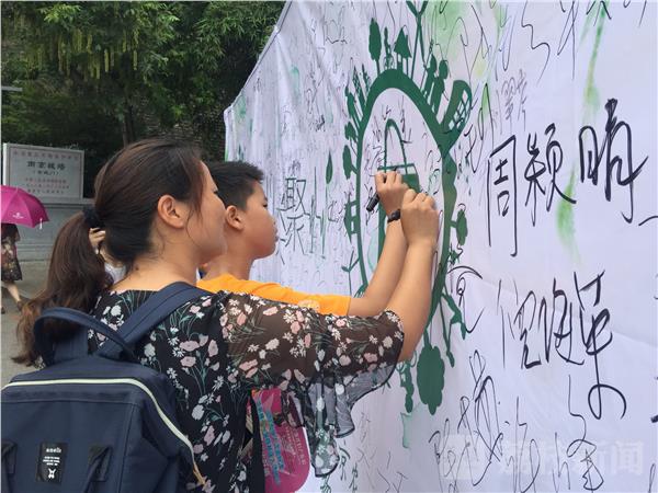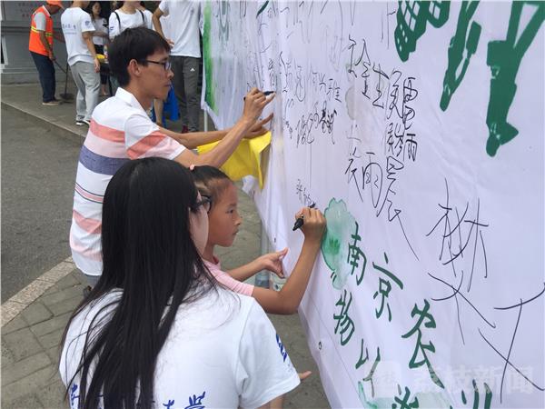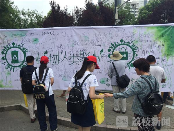 上午9点,在玄武湖公园人流最集中的玄武门景点,南农大师生搭建了一个20平方米的签名墙,他们邀请过往的游客在签名墙上签名,加入垃圾分类的队伍中。学生们还制作了精美的宣传展板,他们把垃圾分为可回收垃圾、厨余垃圾、有害垃圾、其它垃圾四个类别,向市民普及垃圾的分类。“可回收垃圾包括废纸、塑料、玻璃、金属和固料,但是这个废纸不包括卫生纸、草纸,那种纸它水溶性比较强,它不属于可回收垃圾。”记者在现场看到,学生们顶着高温正在给游客们讲解垃圾分类的知识。