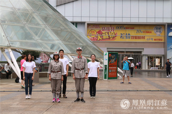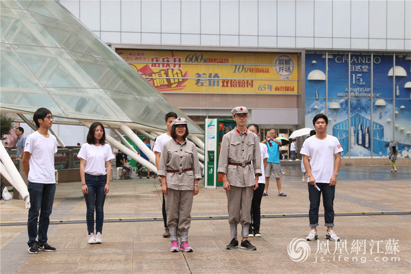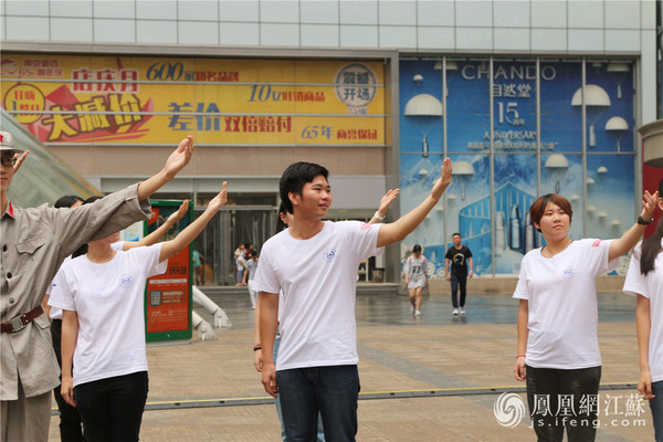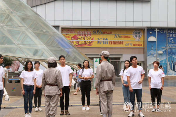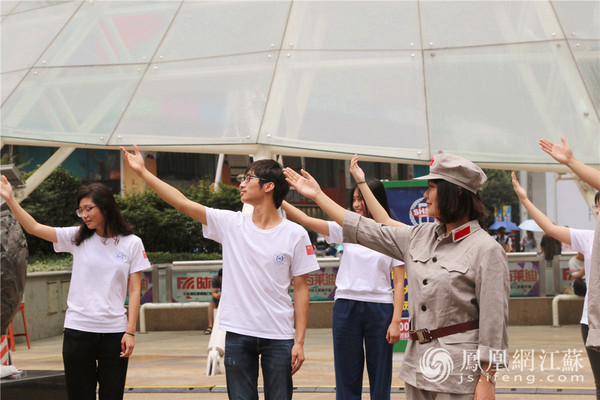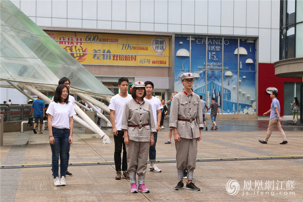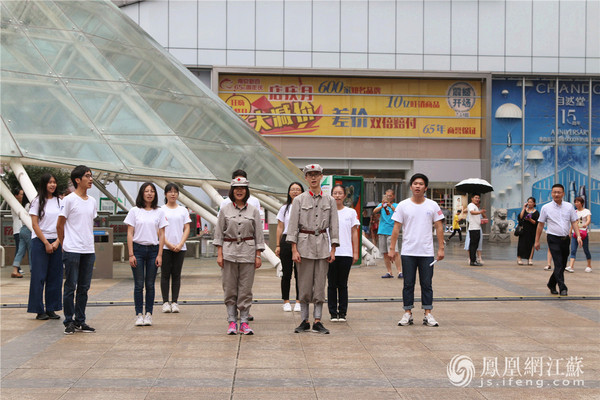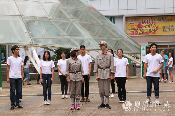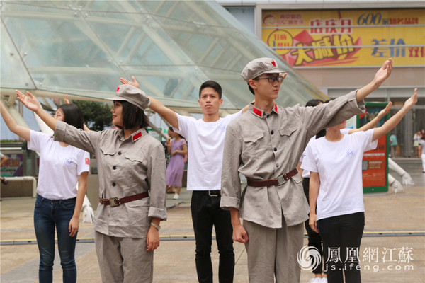 成员们在谈到为何会选择“快闪”这种接地气又“吸睛”的形式时表示,以往在爱国敬军精神的宣传方面,多停留在标语、专题片、讲座等层次。这次希望通过不同于以往的方式,将“八一精神”推广、传播出去。图为南京农业大学学生举行的快闪活动现场。(文/聂茹欣 摄/聂茹欣)