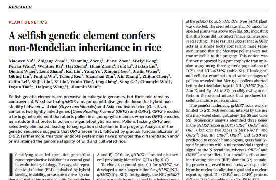 《自私的基因》是英国演化理论学者理查德•道金斯的经典著作,这一概念说的是双亲杂交后,父本或母本中能控制其自身的DNA片段优先遗传给后代的基因,使亲本自身的遗传信息能更多、更快地复制,并能更多地传递给子代,从而维持物种自身的稳定性。近日,南京农业大学万建民院士团队创造性地运用自私基因模型揭示了水稻的杂种不育现象,6月8日,国际顶级学术杂志《科学》Science在线出版了这一突破性成果。
