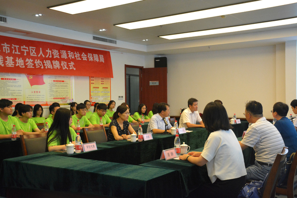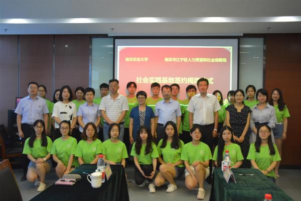 7月19日,南京农业大学“弘法沧澜,和安共济”人力资源管理社会实践基地签约揭牌仪式在南京市江宁区人力资源和社会保障局召开。南京市江宁区人力资源和社会保障局局长杨嘉清、副局长陈国庆、副局长王兰,南京市江宁区人力资源和社会保障局党工委副书记周静,南京农业大学公共管理学院党委书记郭忠兴、党委副书记张树峰,公共管理学院人力资源与社会保障系主任周蕾,公共管理学院本科生辅导员信莹莹等出席了仪式。南京市江宁区人力资源与社会保障局仲裁院、社保科、监察科等科室的负责人,以及“弘法沧澜,和安共济”社会实践团全体成员共同参与了本次签约揭牌仪式。本次活动由南京市江宁区劳动人事争议仲裁院院长裴东担任主持。