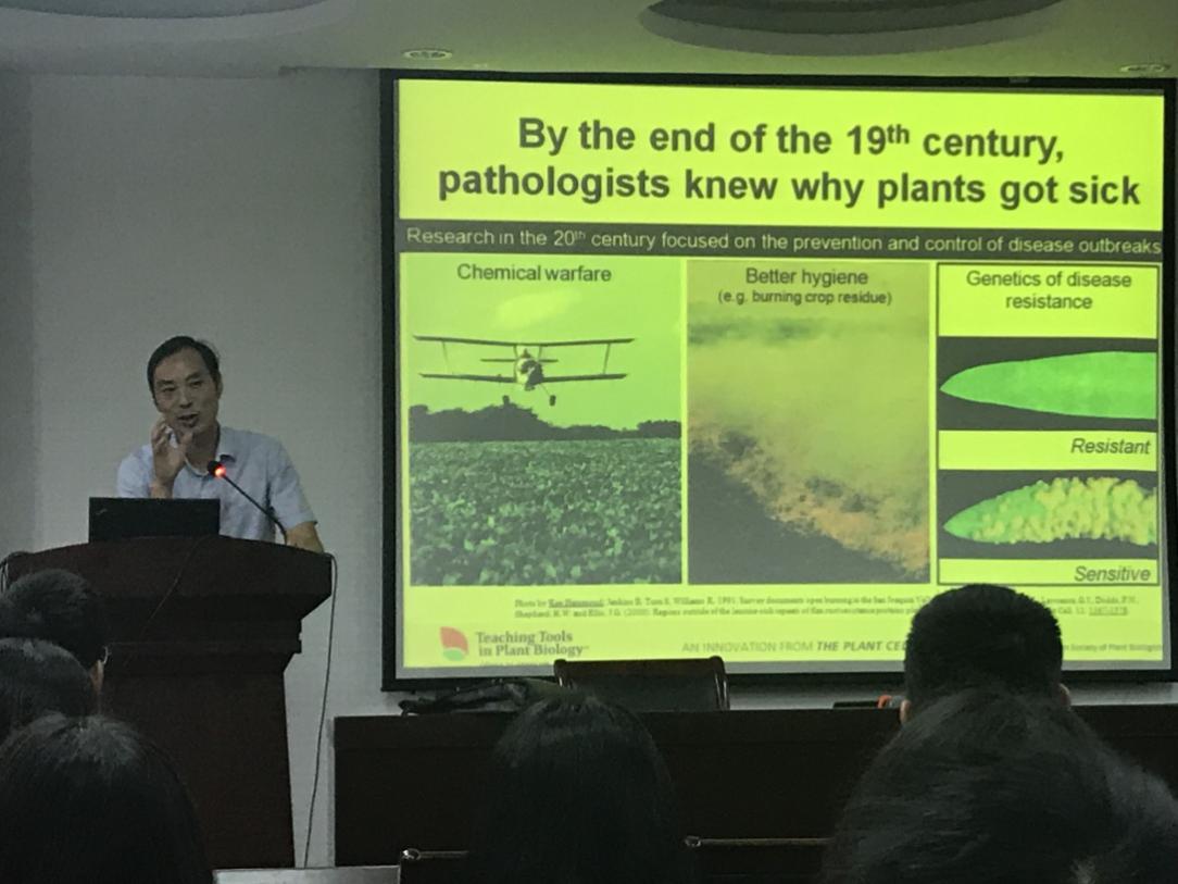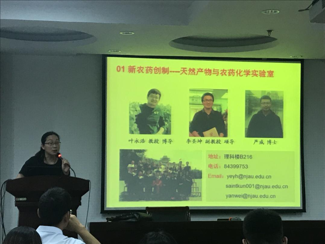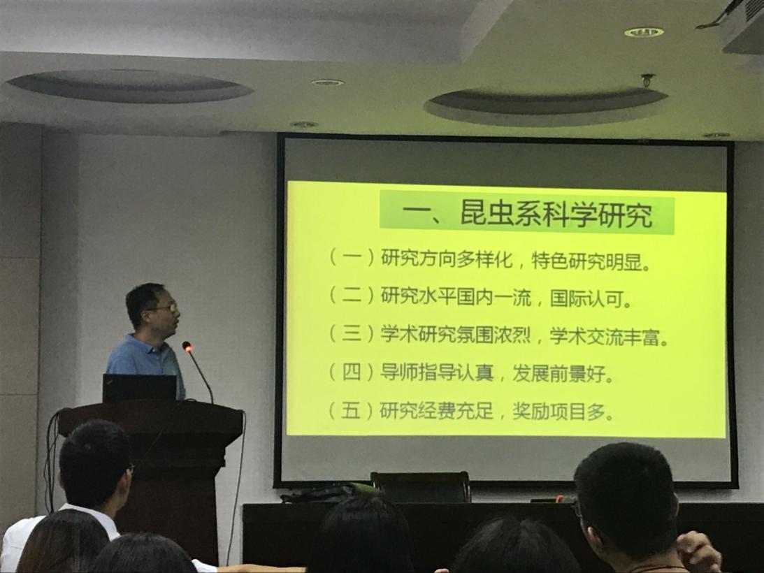本次会议包括植物保护学院简介、2019届深造(保研和考研)政策简介两项议程。首先由窦道龙、王备新、高聪芬从不同的学科研究方向为大家进行了简单的介绍,突显出植保学院悠久的发展历史、杰出的人才队伍、一流的科研平台、领先的研究方向、丰富的科研成果和人才走向,充分展示了学院实力。