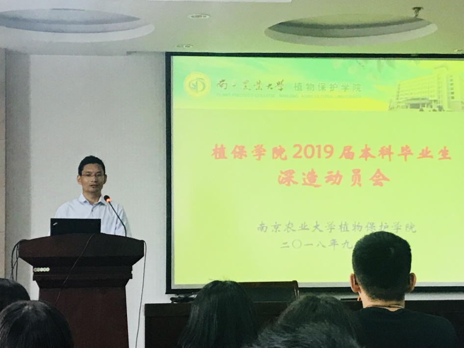 9月7日上午10点,植物保护学院于理科楼C303召开了2019届本科毕业生深造动员会,2019届全体毕业生参加了此次大会。会议由学院党委副书记黄绍华主持,植物病理学系教授窦道龙、昆虫学系教授王备新以及副教授金琳、农药系教授高聪芬出席了本次会议。